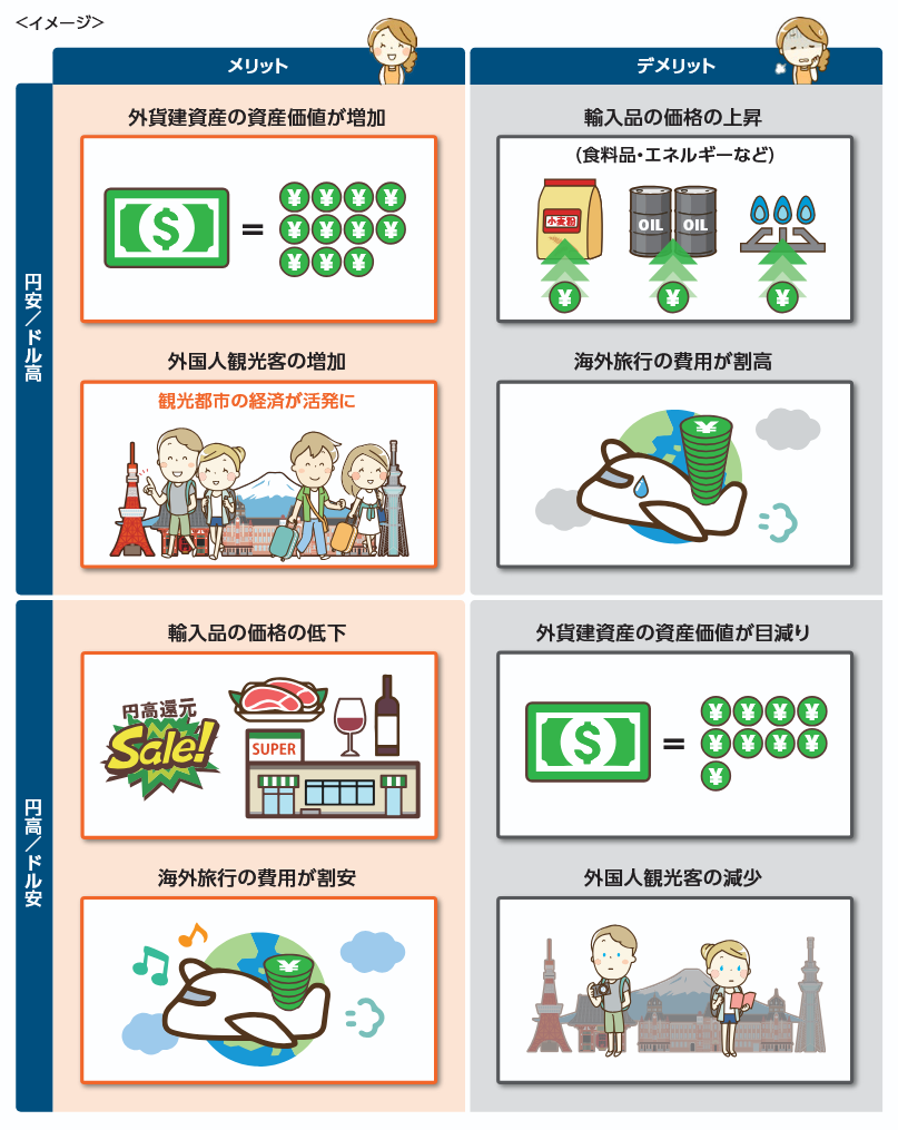 逆に円高のときは、1ドルを少ない円にしか替えられない状態です。