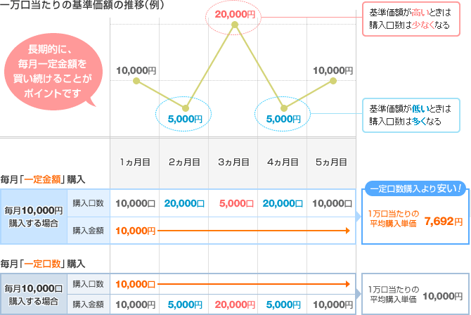 たとえば、毎月1万円で同じ投資信託を買うとします。