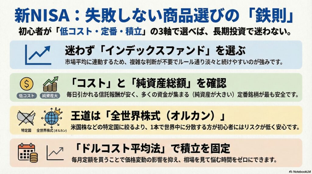 最初に指数とコストと純資産という判断軸を固定すると、途中で情報が増えても迷いにくくなります。