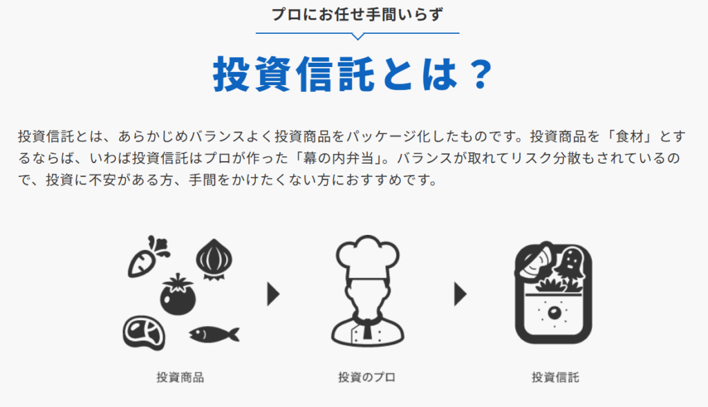 基本的に対象は投資信託とETFで、金融庁の基準を満たし対象商品として選定されたものです。